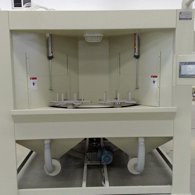 設(shè)備共大轉(zhuǎn)盤共設(shè)置多個小轉(zhuǎn)盤,噴砂區(qū)域內(nèi)共布置12支普壓高速噴砂槍,在噴砂每個加工位上部設(shè)3支噴槍對工件需噴砂部位做擺動噴砂加工,噴槍可根據(jù)加工需要,隨意調(diào)整其噴射角度